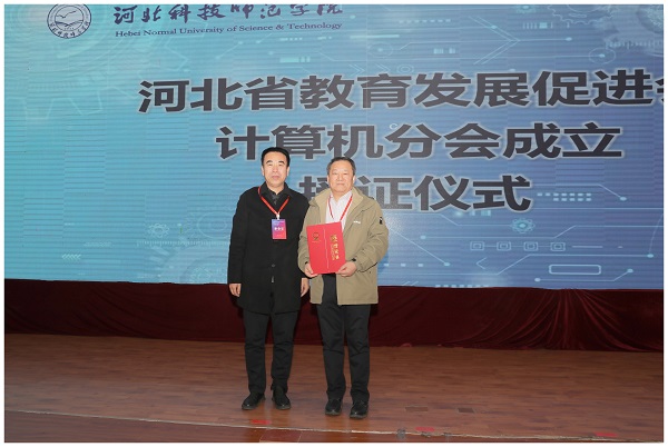会上,张书华副会长授权成立河北省教育发展促进会计算机分会,副校长刘荣昌教授为赵立强教授颁发计算机分会会长证书,会长赵立强教授为定州市职业技术教育中心、迁安市职业技术教育中心等来自省内11个地区的12所职教中心授权为分会副会长单位。计算机分会成立职业教育计算机虚拟教研室。
